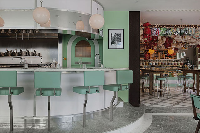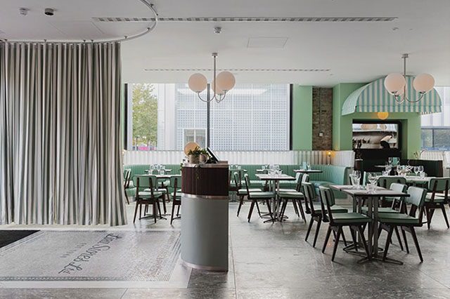 此次餐厅主要设计元素包括定制的大理石绿色和白色地板,复古马赛克和经过回收的原始不透明地球仪灯,这些灯源来自历史悠久的熟食店,为大型新空间提供了照明。