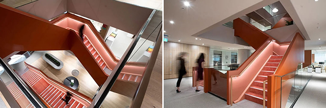 这处集会公共空间就是想要促进更多的协作,允许团队和客户以一种轻松愉悦的方式进行互动,这里就像是一个可以激发活力的城市广场。集会公共空间还有助于知识交流和分享,鼓励大家打破各种壁垒,让不同的团队和客户在这里展开多层面的交流互动,将酒店的氛围和工作场所融合到这个公共办公空间当中。动感的楼梯空间是连接八个楼层的关键因素,通过精心设计的动感楼梯和平面布局,可以随着视角的运动而出现不同的变化,在较小的空间当中实现更大的连接,高效化利用整个空间的每一个地方。在楼梯设计的时候主要面临的挑战是防火分区,因此设计团队并没有将所有的楼梯空间都对齐,而是在特定的楼层中,楼梯空间做成一种错位,以便在紧急的时候,防火幕能够落下并密封整个建筑体。